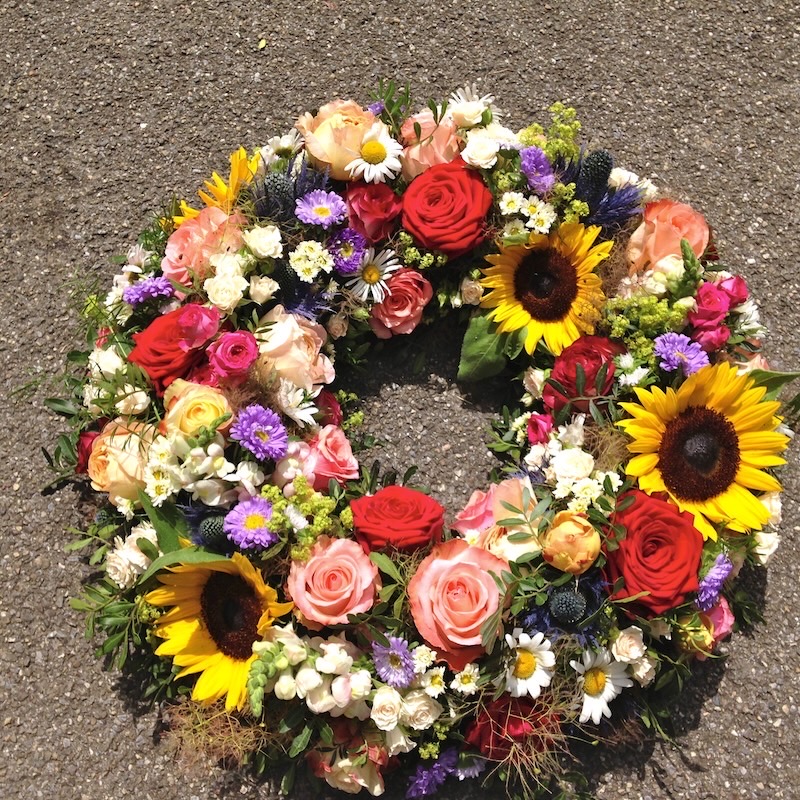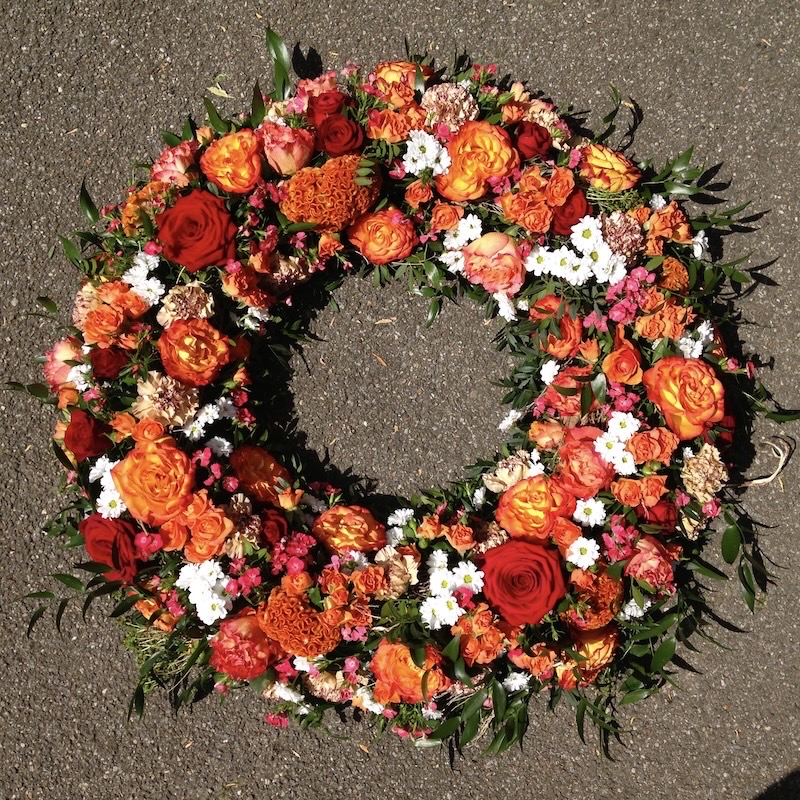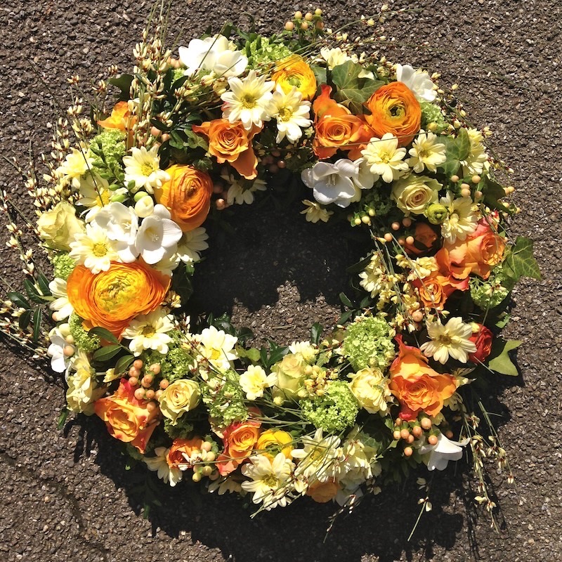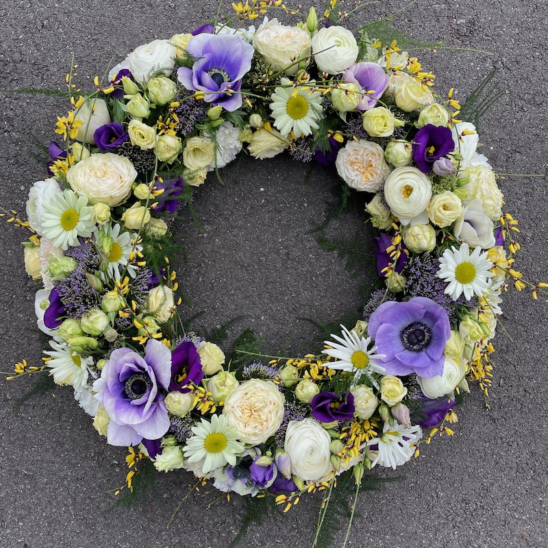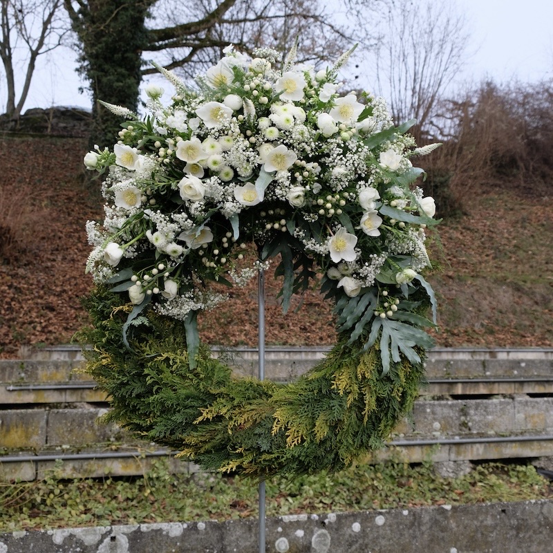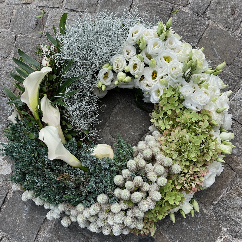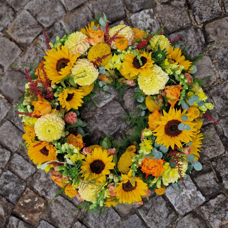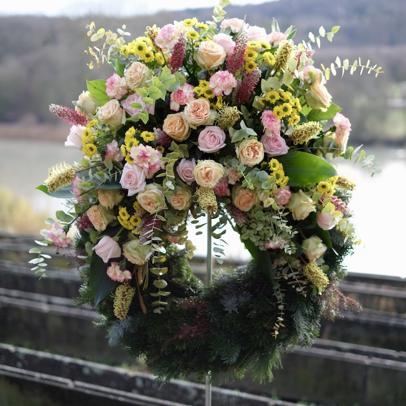Trauerkranz mit saisonalen Blumen. Die Blumen können in Art und Farbe je nach Verfügbarkeit abweichen.