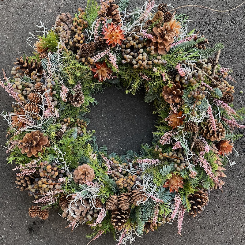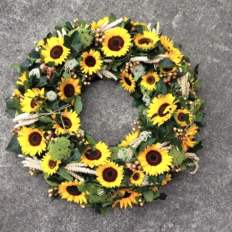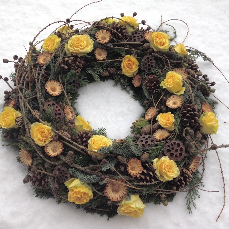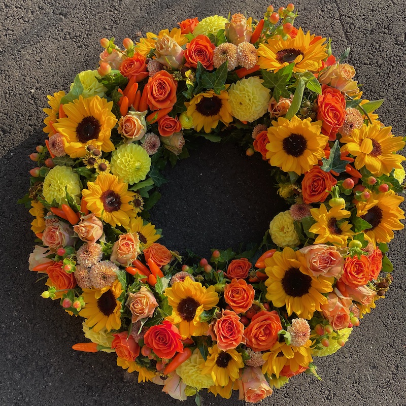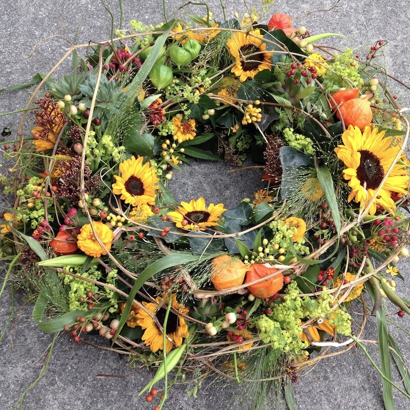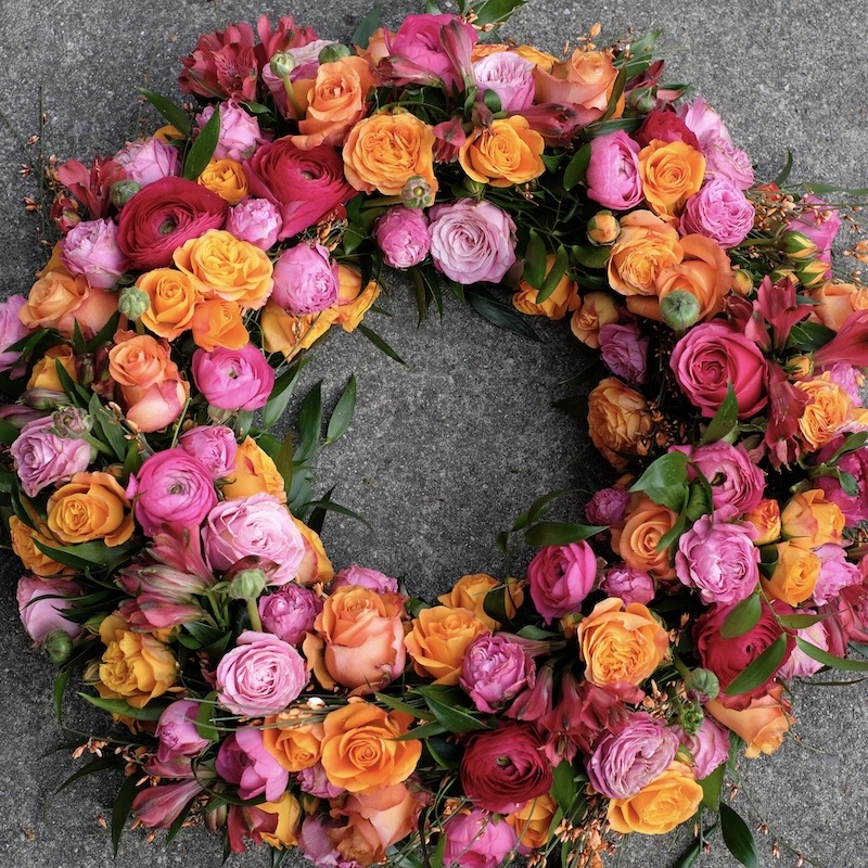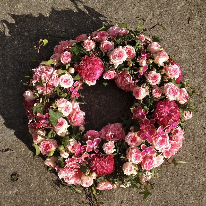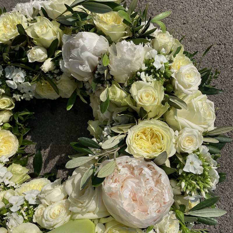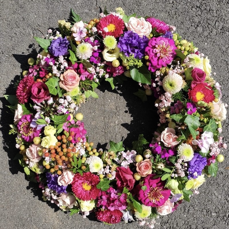 Trauerkranz mit saisonalen Blumen. Die Blumen können in Art und Farbe je nach Verfügbarkeit abweichen.