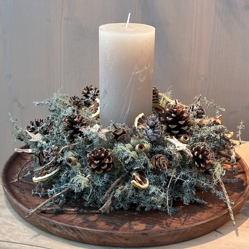 Winter Kranz inkl. Windlicht mit oder ohne Teller. Die Blumen können in Art und Farbe je nach Verfügbarkeit abweichen.
